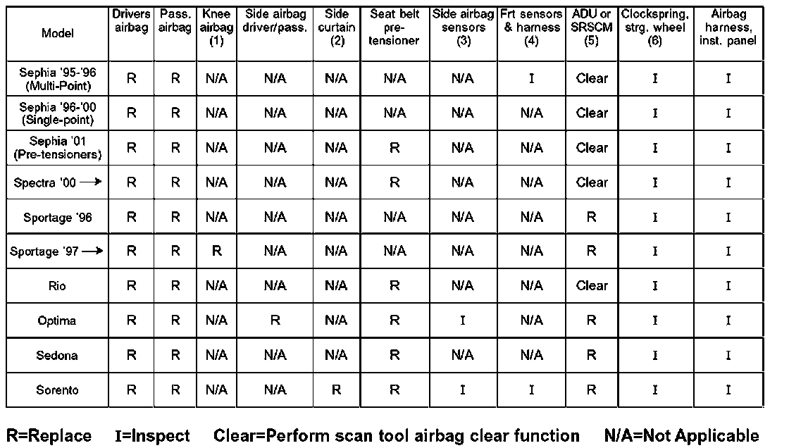 After a collision in which the airbags deploy, there are certain parts that require replacement and some that only require inspection to ensure their serviceability. Refer to the chart for specific inspection/replacement information.
