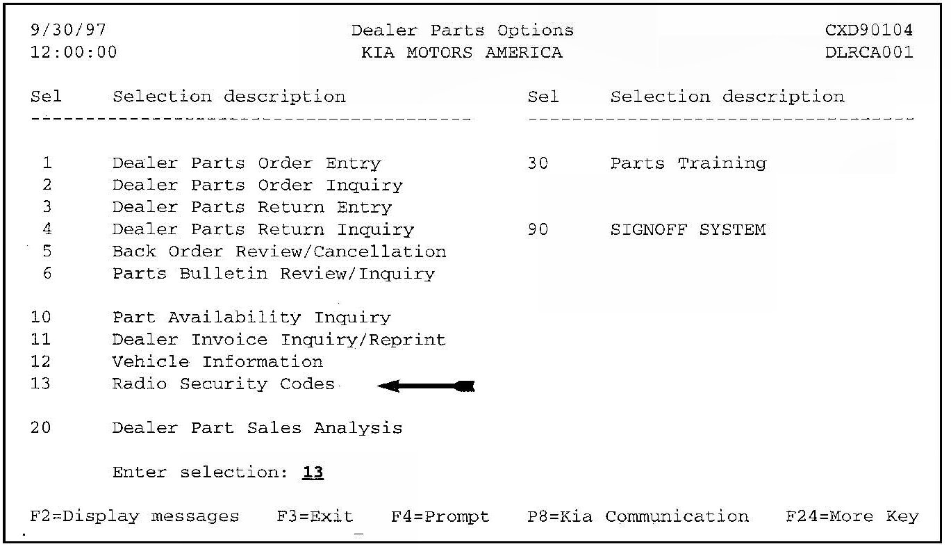 1. Through the Dealer Parts System screen, enter selection 13, Radio Security Codes (or selection 3 through the Dealer Warranty/Service screen).