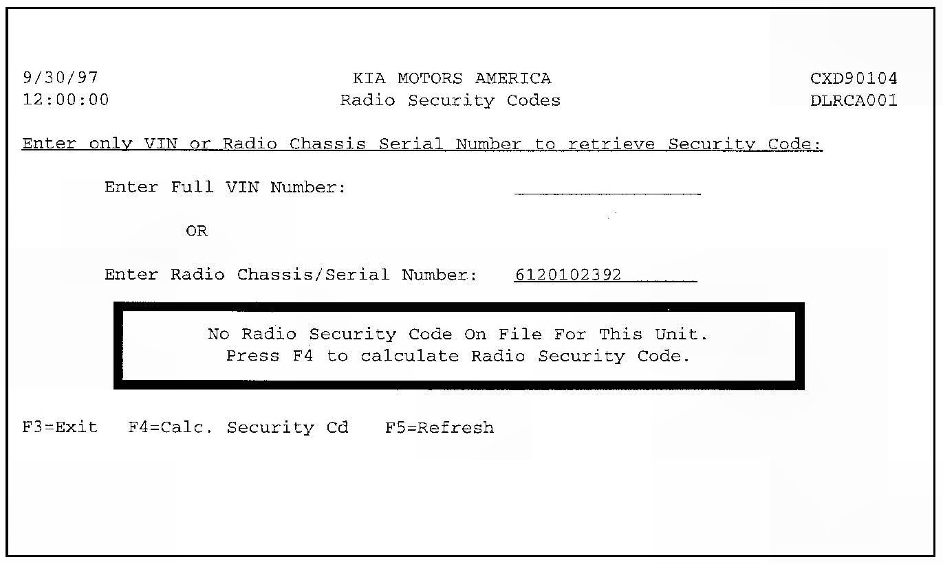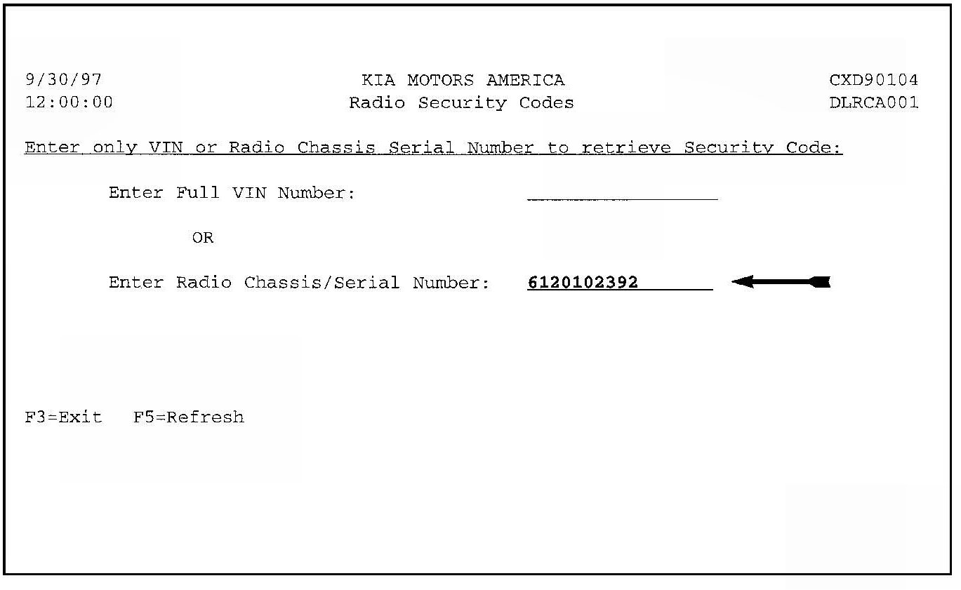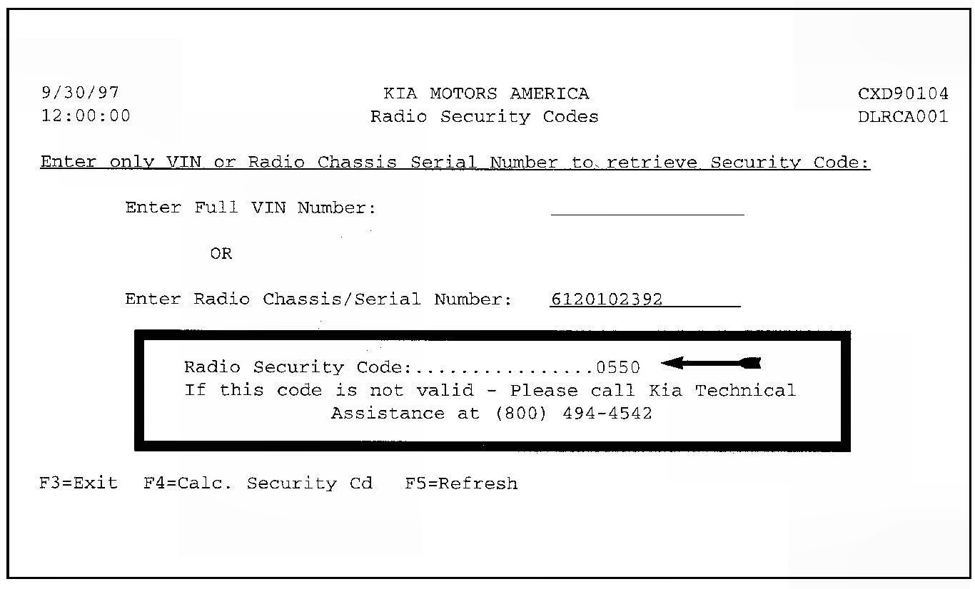 The retrieval procedures contained in this bulletin can only be used to retrieve radio security codes for 1996 and later vehicles. Radio security codes for 1995 and prior vehicles can be obtained by calling the Kia Technical Assistance Center To avoid delay please provide the representative with the radio chassis number or include it when leaving a message. By doing this the technical assistance center representative will have your radio security code when he calls back.