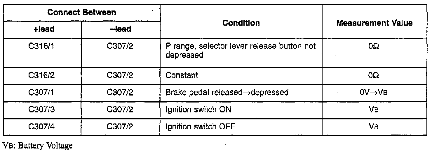 2. Shift the selector lever to P range, and check terminal voltages and continuity, referring to the chart.
