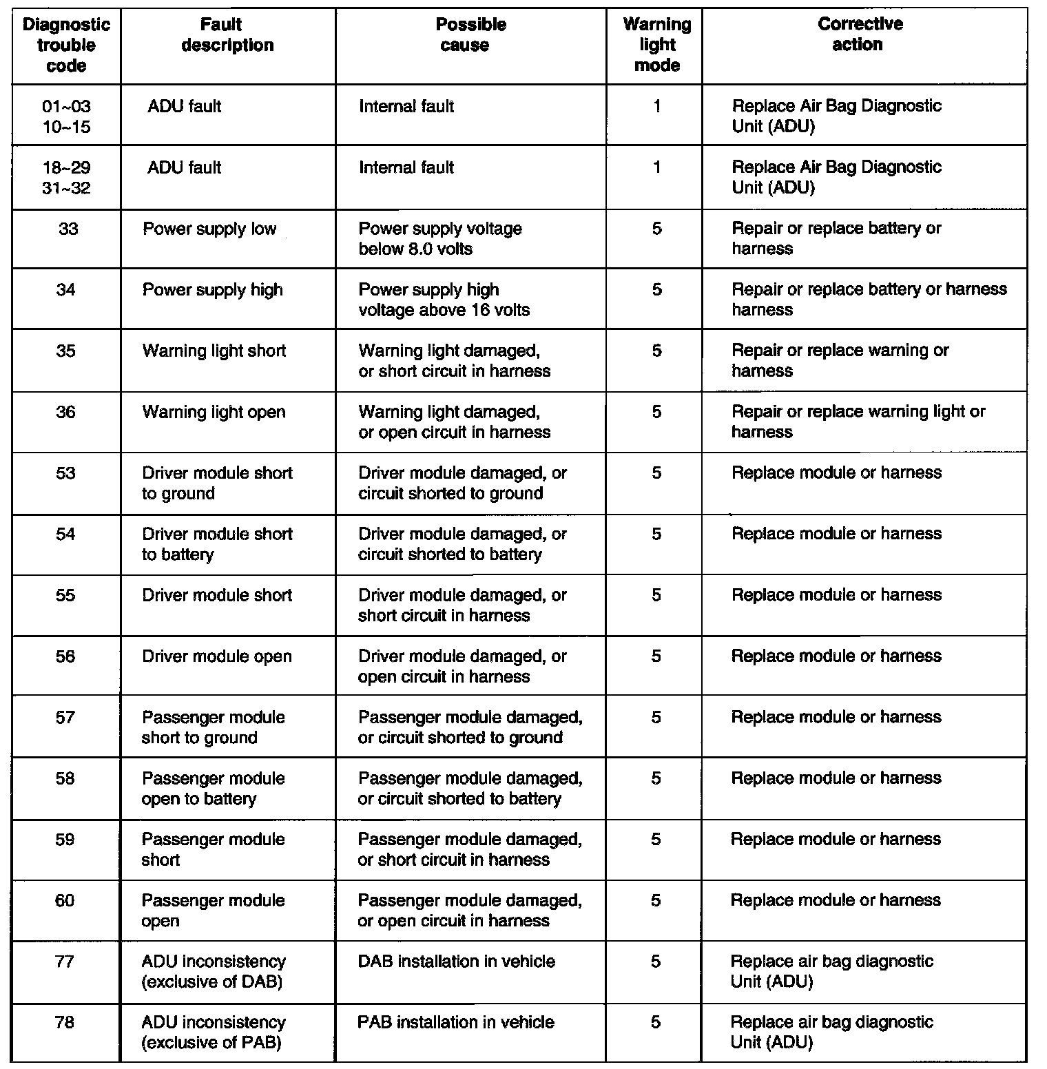 Mode 5: Warning Light will be illuminated for reminder of ignition ON cycle, but will go out right away if fault has self-corrected.