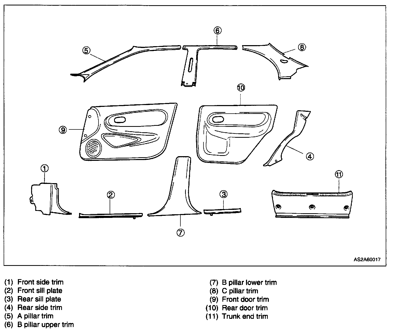 It is used on all four doors of vehicle door opening sills, A, B and C pillars, front side, rear side and end trim. All door trim on vehicle includes pull handle. Each trim on front two doors provides a pocket for keeping maps, etc.