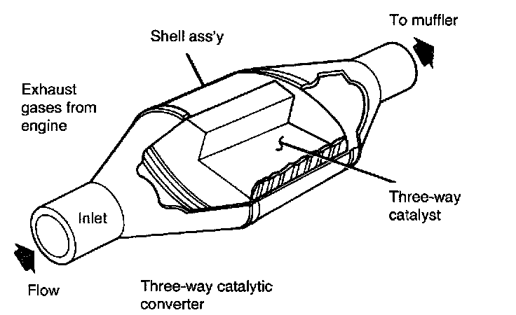 Their emissions must be controlled. The warm-up catalytic converter is positioned as far upstream in the exhaust flow as possible to take advantage of the high exhaust temperatures in the manifold. The operating temperature of the warm-up catalytic converter increases very rapidly after initial cold start to decrease the amount of emissions emitted during cold engine operation. The three-way catalytic converter is mounted, in-line, between the header pipe and the pre-silencer. It reacts with exhaust gases to convert them to less harmful products and therefore reduce the pollutant levels to within legally prescribed limits. The catalytic metals are thin-coated onto and supported by a honeycomb-shaped, high temperature ceramic. The honeycomb is mounted inside the converter shell which is surrounded by a heat shield. This design produces little restriction to the flow of exhaust gases and has proven to be durable.