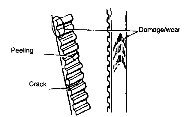 2. Check timing belt for uneven wear, fraying, peeling, cracking and hardening. Replace timing belt as necessary.