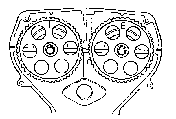 4. Check that "I" mark on intake camshaft pulley is aligned with mark on cylinder head cover and "E" mark on exhaust camshaft pulley is aligned with mark on cylinder head cover.