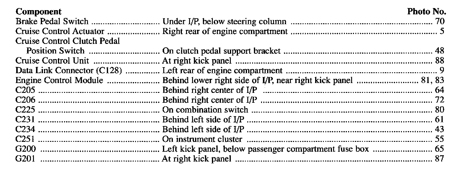 A component location index follows each schematic. Except for the location of obvious components, like Headlights, the index lists the location of every component, connector and ground in the schematic. The index also gives references to component location photographs.
