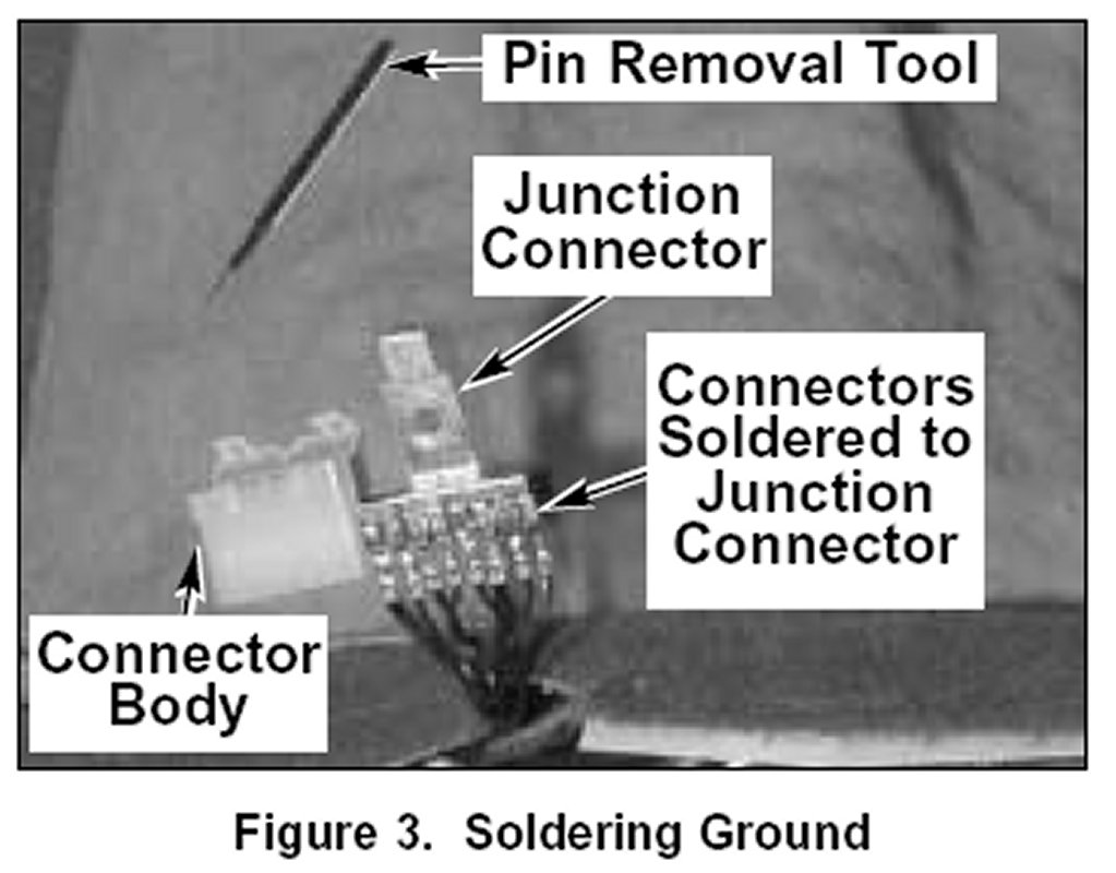 8. Using a high wattage soldering gun, solder each of the female connectors onto the metal junction connector and reinstall into the vehicle.