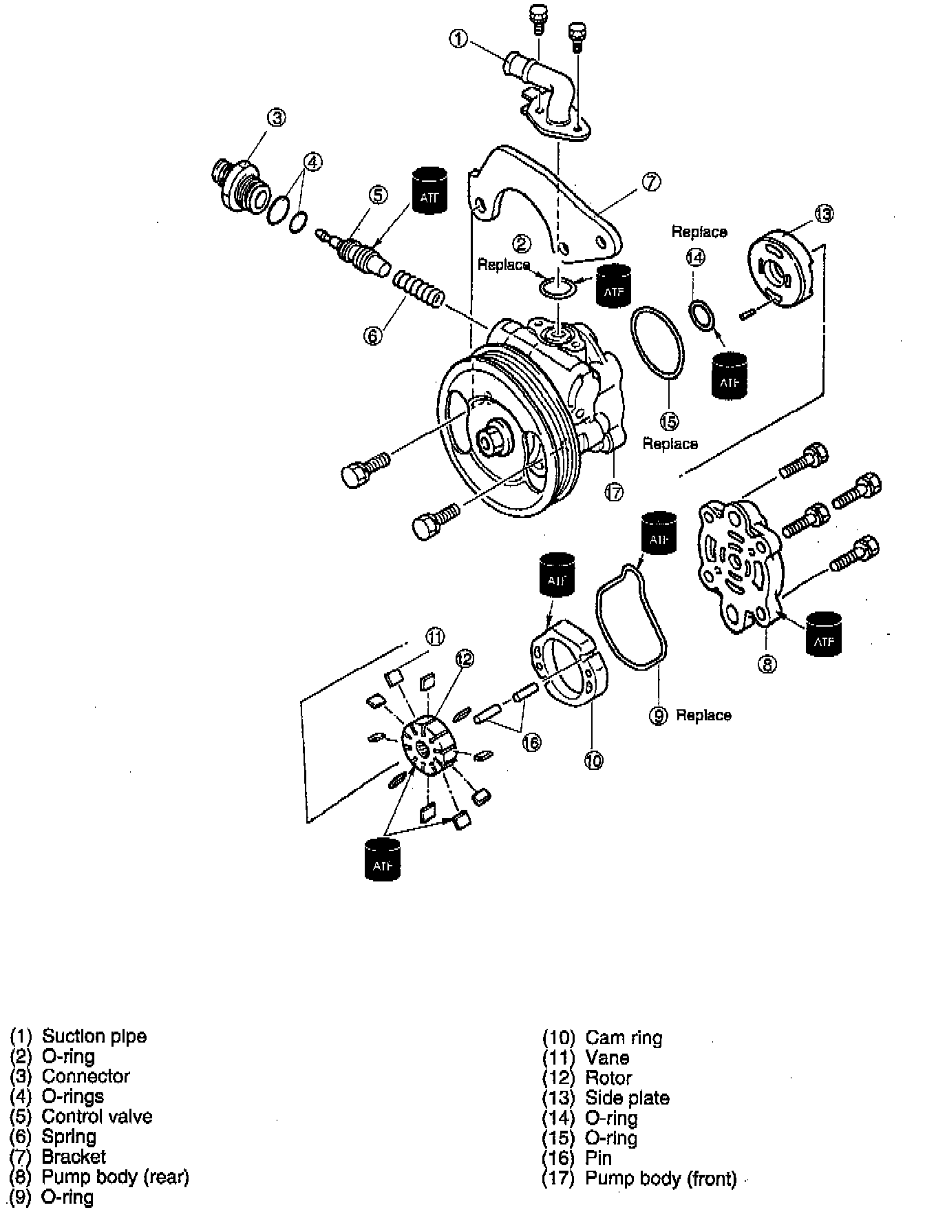 1. Secure power steering pump in a vise equipped with protective jaw caps.