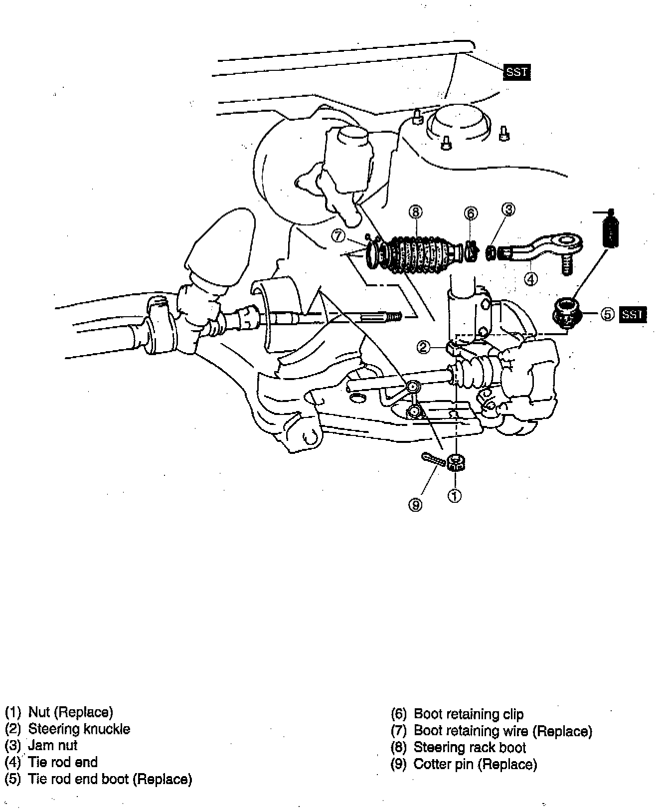 6. Remove tie rod from knuckle arm with Special Service Tools (SST) (OK130 283 021 or equivalent).