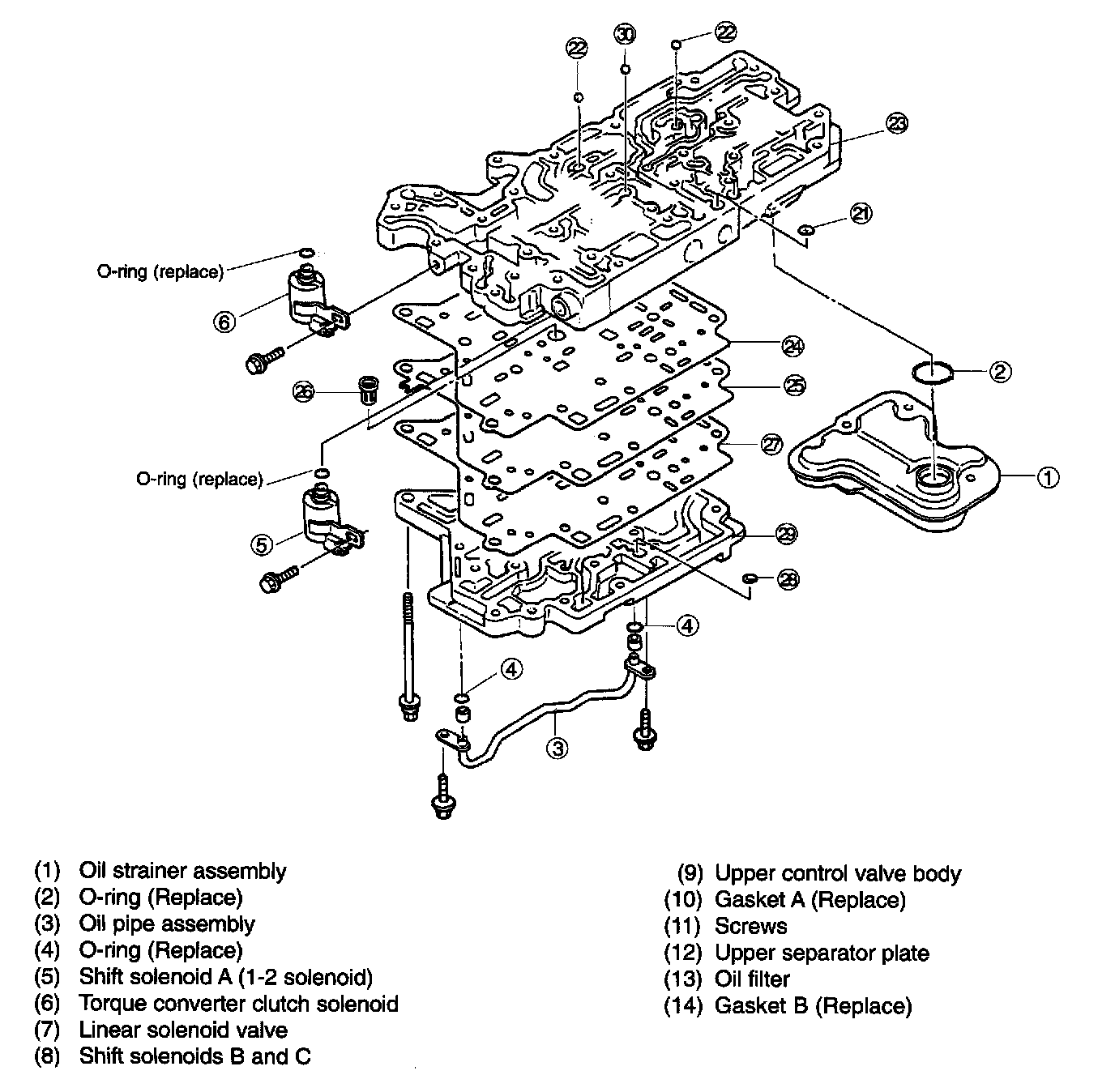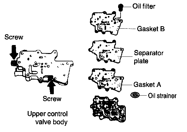 9. Remove gasket B, upper separator plate, oil filter, oil strainer and gasket A.