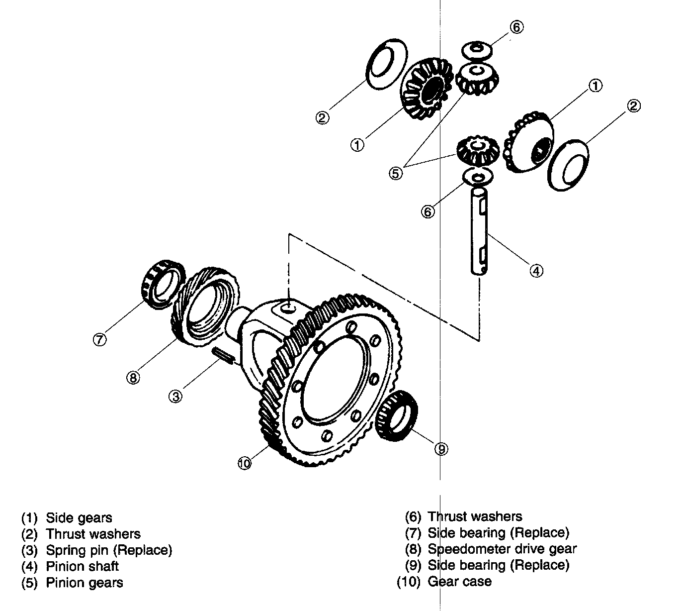 2. Place gear case on a vise and knock pin out with suitable pin punch and hammer. Then remove two thrust washers, two pinion gears and pinion shaft.