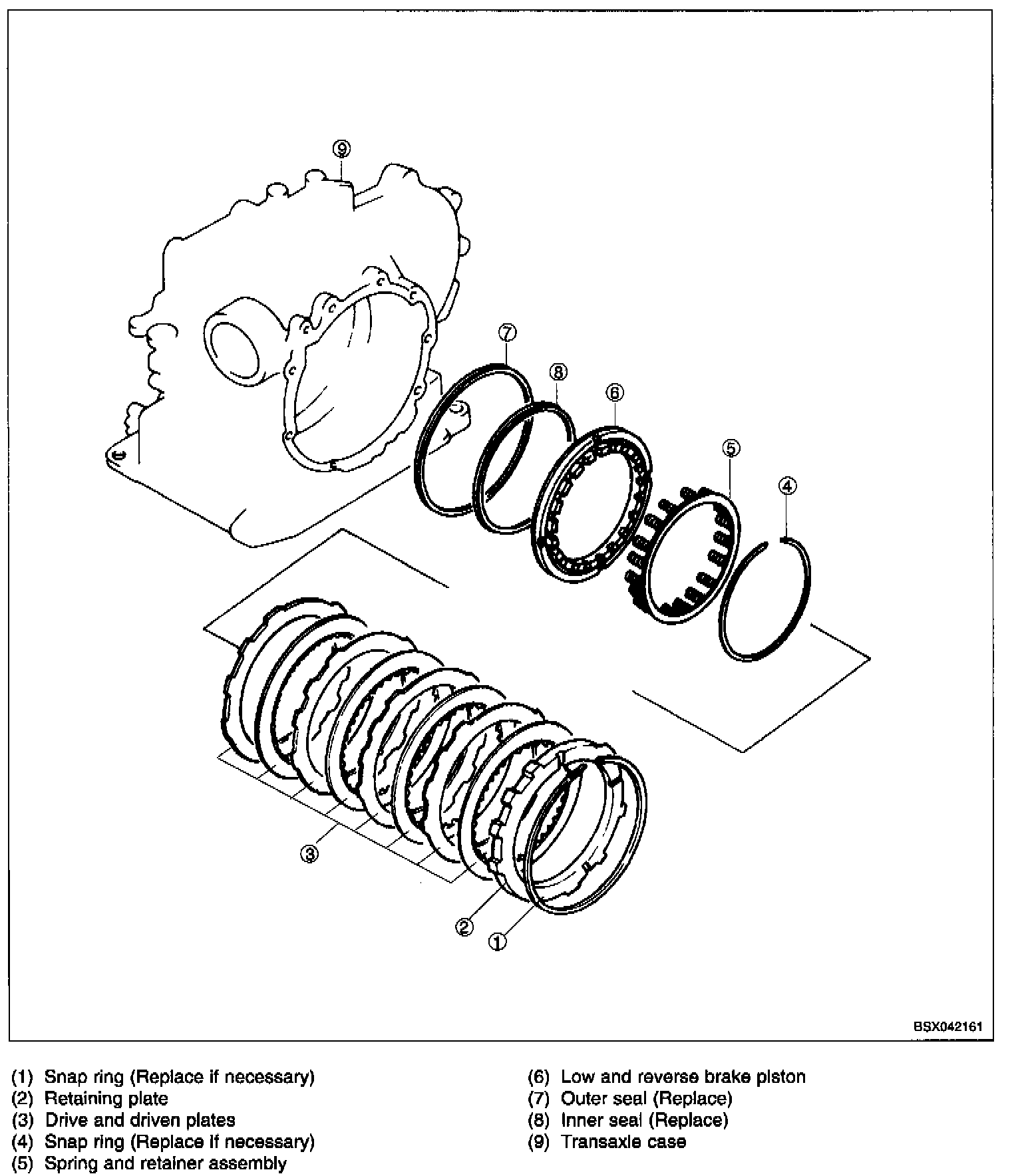 13. Remove snap ring, retaining plate, drive and driven plates and set aside for later assembly.