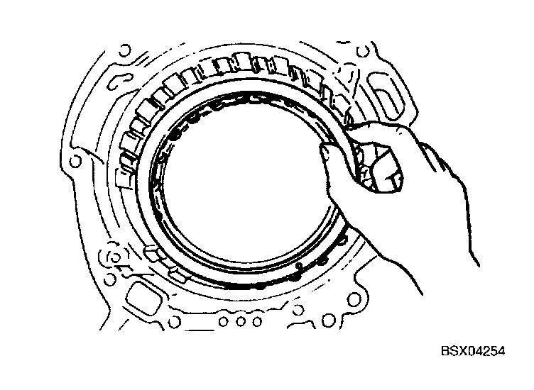 c. Install low and reverse brake piston by pushing evenly around circumference, being careful not to damage outer seal.