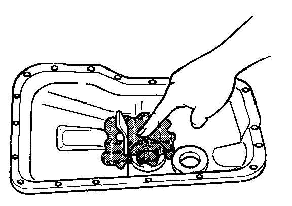 NOTICE: Remove oil pan before turning transaxle over. This will ensure that any foreign material remains in pan.