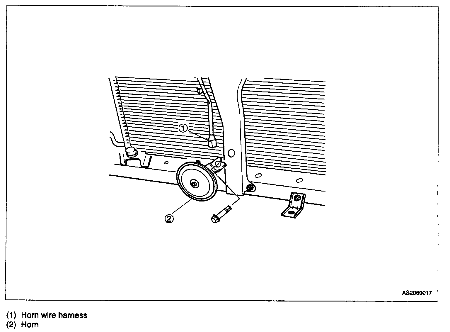 Vehicle is equipped with one horn mounted behind front bumper at the center. Operation of horn is controlled by a switch (horn button) located on steering wheel. Electrical power from positive side of battery is applied to a horn relay located in fuse box of engine room. When horn button is pressed, horn relay is energized, and electrical power is directed to horn. Circuit is completed by case-ground of horn, and horn sounds. When force is removed from horn button, springs force button upward to open horn switch. Relay is de-energized and horn operation stops.