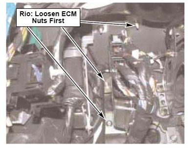 7. Rio only: loosen and remove (3) mounting nuts that secure ECM mounting bracket to firewall (these are also used to secure TCM).