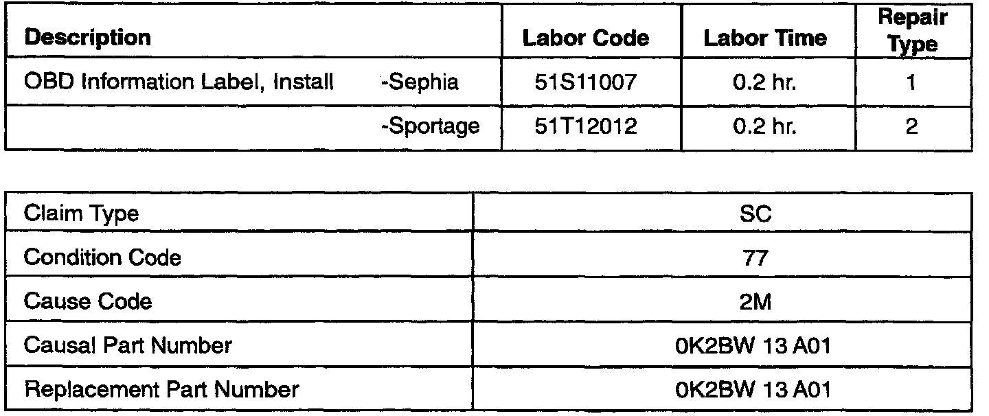 There is no charge to the customer for installation of their label. Under applicable law, you may not sell or otherwise deliver any affected Sephia or Sportage until you have attached the OBD Information label using the instructions as shown.