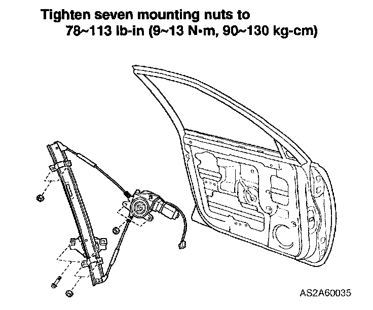 i. Tighten two glass mounting bolts on power window regulator assembly.