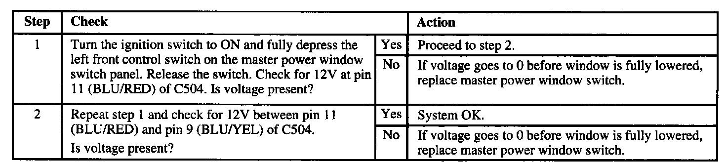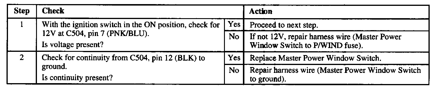 Preliminary Check: Check condition of P/WIND RH and P/WIND LH fuses. If fuse is open, locate and repair source of overload. Replace fuse. Verify battery voltage (12 V) at P/WIND RH and P/WND LH fuses. If no battery voltage, check battery and fuse box.