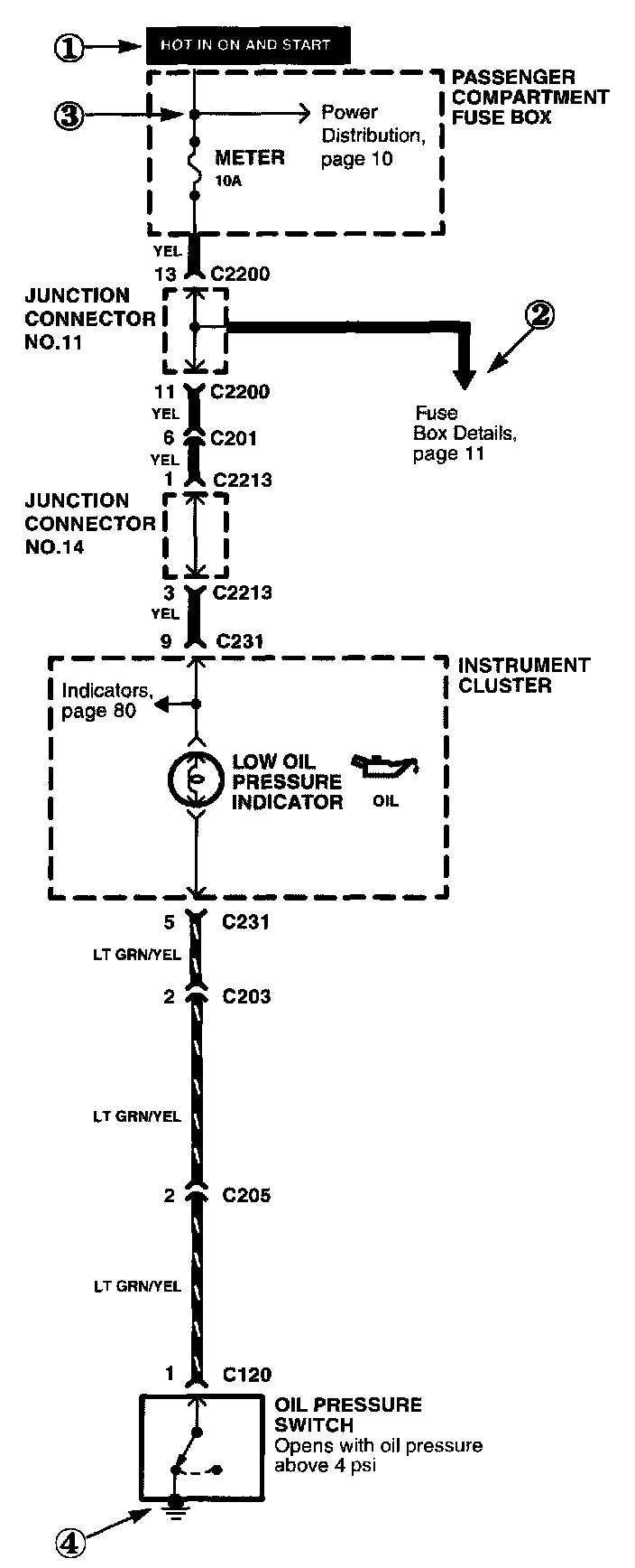 Each schematic is arranged so current flows from power at the top of the page, to ground at the bottom. The "HOT" labels (1) at the top of a fuse tell you when the ignition switch supplies power to that fuse.