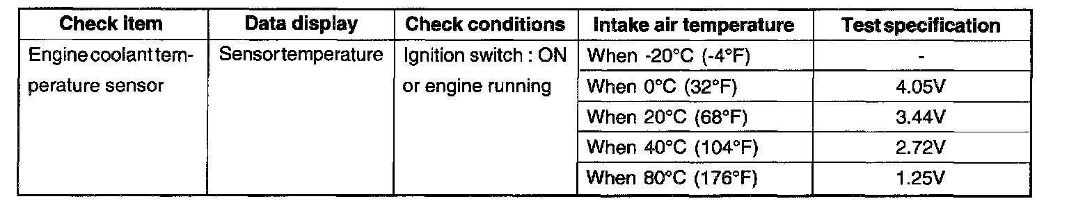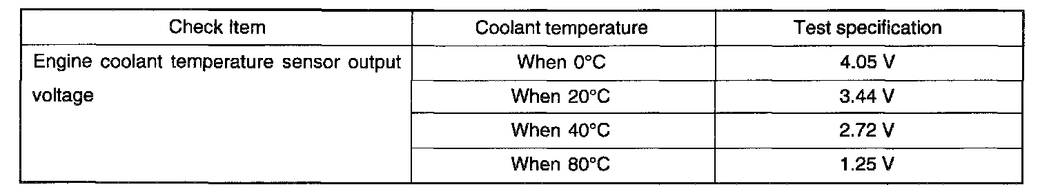 The engine coolant temperature sensor is installed in the engine coolant passage of the cylinder head, detects engine coolant temperature and emits signals to the ECM. This part employs a thermistor which is sensitive to changes in temperature. The electric resistance of a thermistor decreases in response to temperature rise. The ECM judges engine coolant temperature by the sensor output voltage and provides optimum fuel enrichment when the engine is cold.