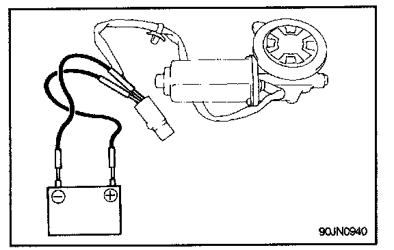 Connect the motor terminals directly to the battery and check that the motor operates smoothly. Next, reverse the polarity and check that the motor operates smoothly in the reverse direction. If the operation is abnormal, replace the motor.