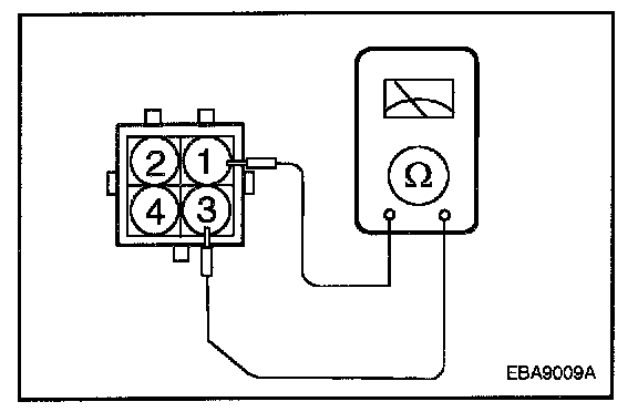 Measure the resistance between connector terminals 1 and 2 (the coils at the No. 3 and No. 6 cylinder sides) of the ignition coil, and between terminals 1 and 3 (the coils at the No. 1 and No. 4 cylinder sides), and between terminals 1 and 4 (the coils at the No. 2 and No. 5 cylinder sides)