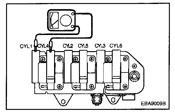 Measure the resistance between the high-voltage terminal for the No. 3 and No. 6 cylinders, between the high-voltage terminals for the No. 1 and No. 4 cylinders and between the high-voltage terminals for the No. 2 and No. 5 cylinders.