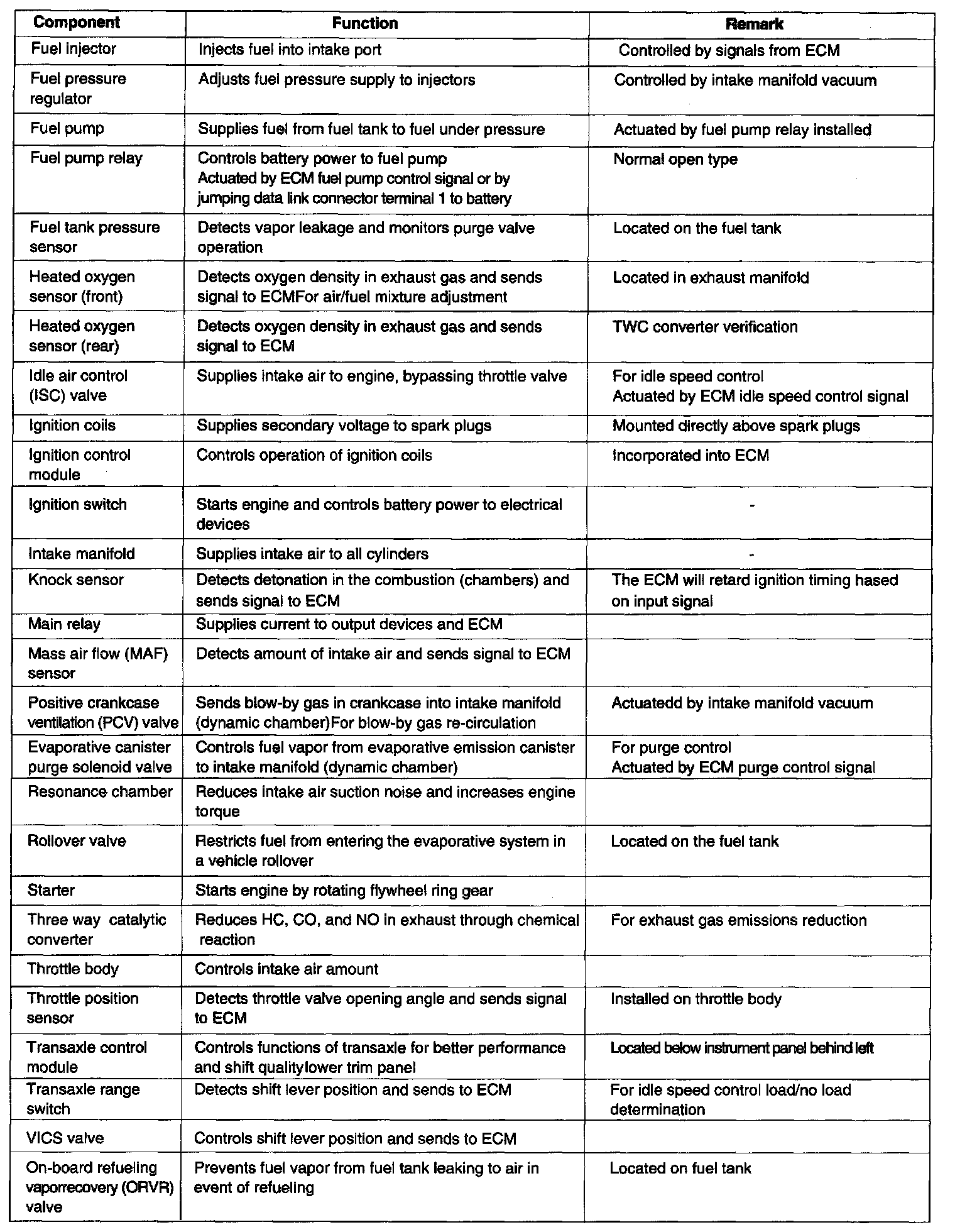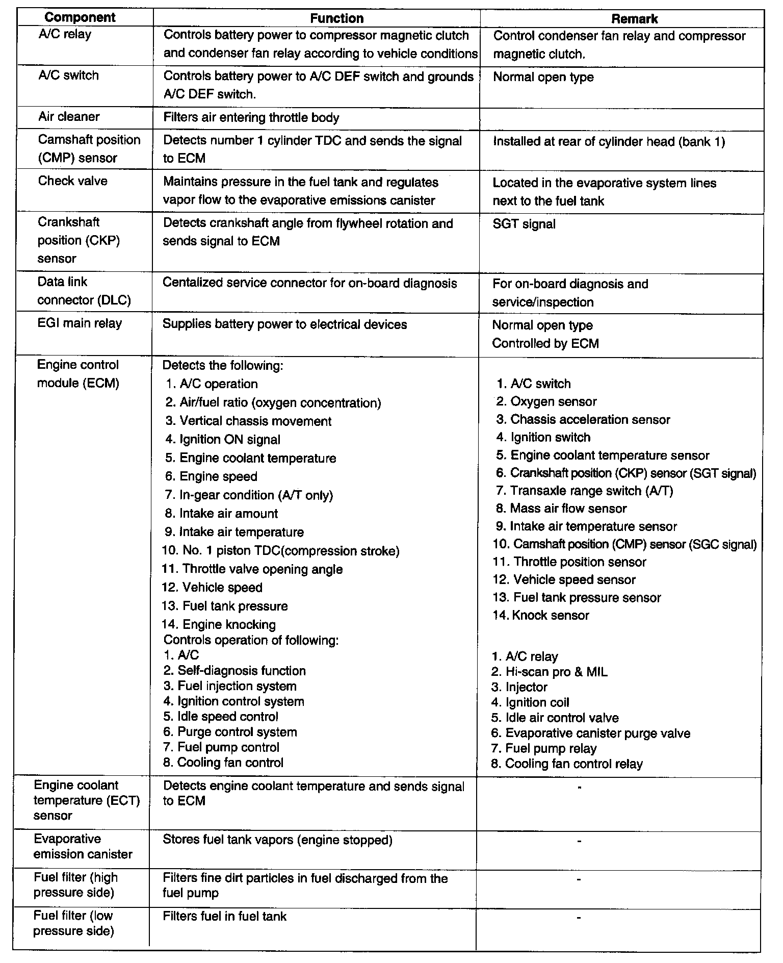 Component Description Table, Part 1: