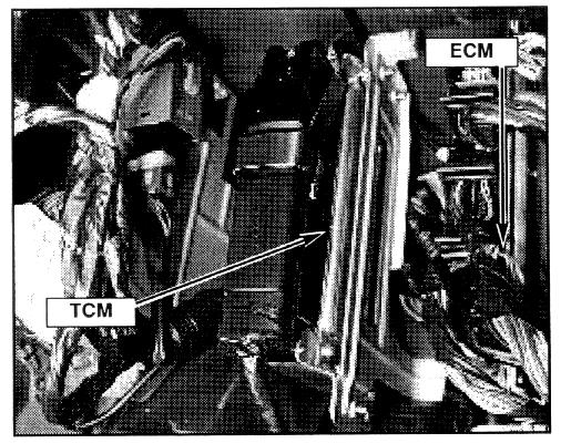 2. Locate ECM and TCM units under left lower dash board area, near kick panel. (Photo taken with dashboard removed for clarity only.)