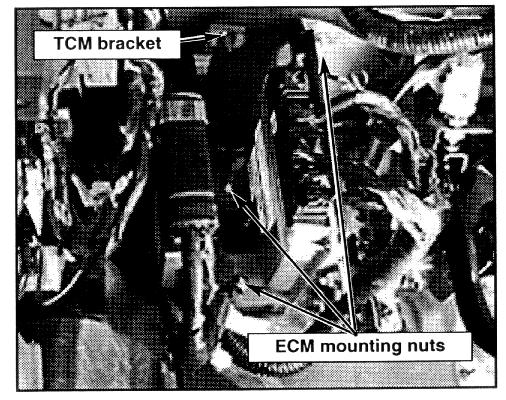 3. Loosen and remove forward mounting nuts (2) that secure ECM mounting bracket to firewall. (These two forward mounting nuts also secure the TCM bracket.)