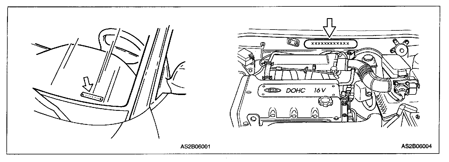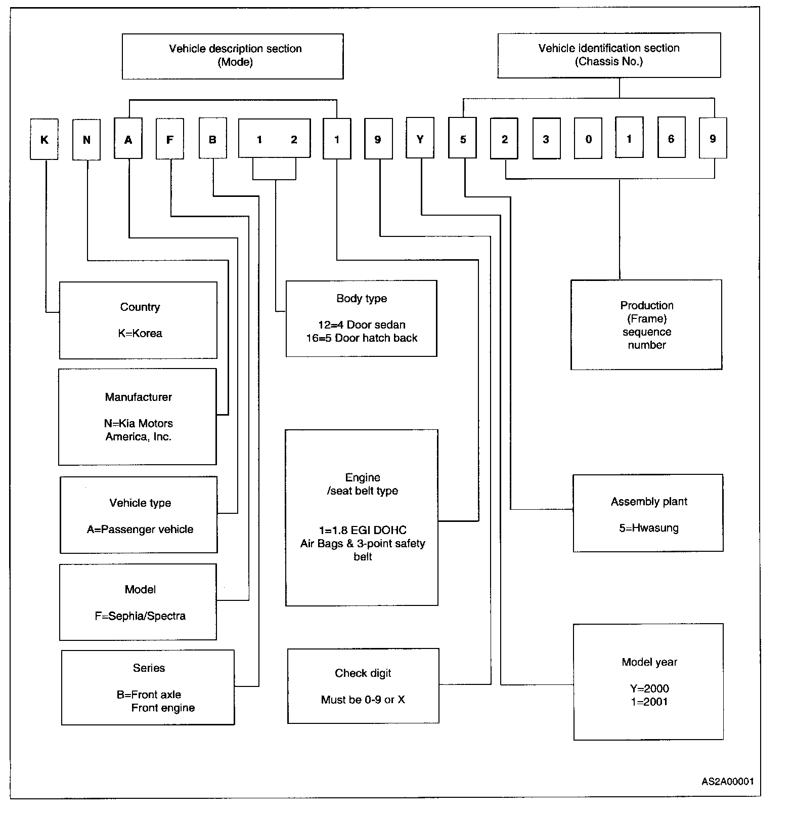 The vehicle identification number (VIN) for the Kia Sephia is a 17-digit stamped on a metal plate that is located on the driver's side of the instrument panel visible from outside of the vehicle through the windshield. The VIN is also stamped into the passenger side of the engine compartment bulkhead. The VIN is composed of the following codes: