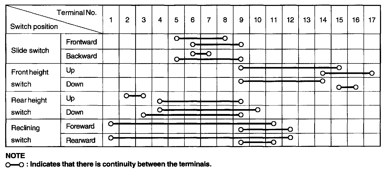 INSPECTION OF POWER SEAT SWITCHOperate the power seat switch and check for continuity between terminals. If continuity is not as specified, replace the switch.