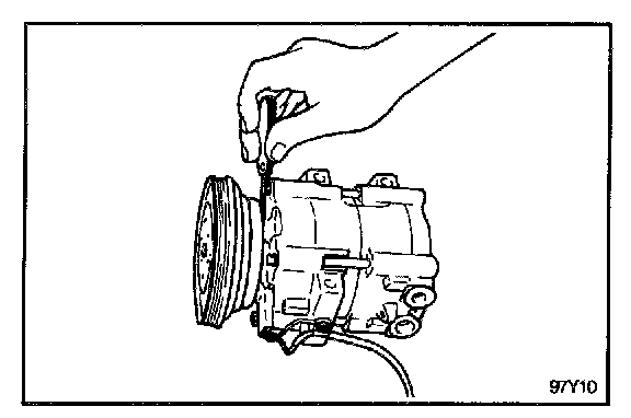 1. After reassembling the compressor assembly as the reverse of disassembly procedure given, check the clutch air gap between the clutch hub and the pulley mating surface with a feeler gauge. The air gap should be as follows