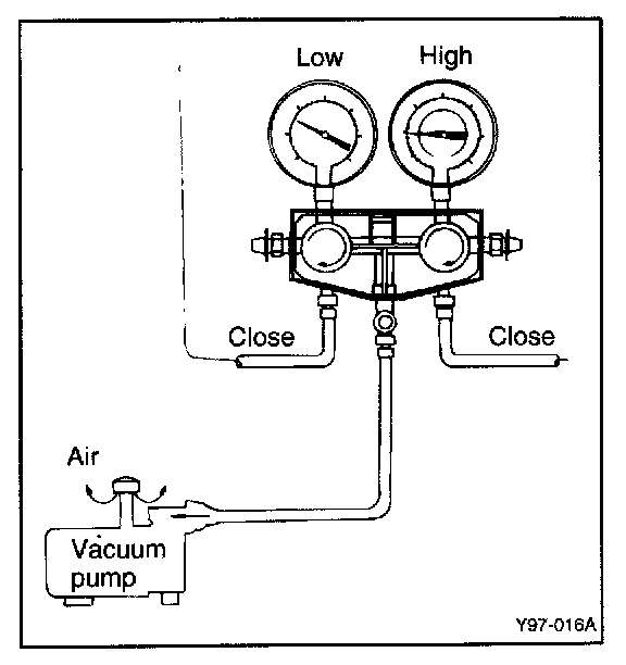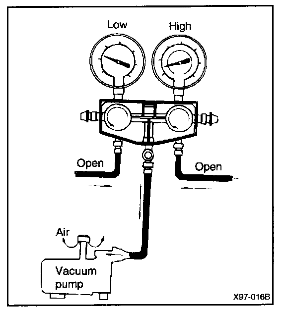 6. After about ten minutes, check that the low pressure gauge reads more than 94.39 kPa (0.96 kg/sq.cm, 13.7 psi) vacuum. If negative pressure can not be obtained, there is a leak in the system. In this case, repair the leak as described in the following.
