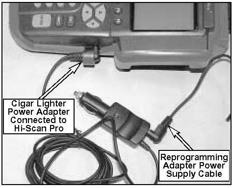 4. Connect the cigar lighter power adapter to the Hi-Scan Pro and connect the reprogramming adapter power supply cable to the cigar lighter power adapter.