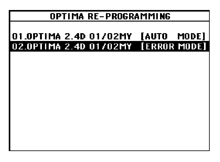 13. Select "02. OPTIMA 2.4D O1/02MY (ERROR MODE)" and press the "ENTER" key.