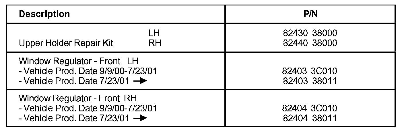 This bulletin provides information relating to window regulator repair on Optima. Some 2001-2002MY Optima models produced before 12/4/01 may experience conditions where the front door glass will not go up or down properly and/or will not stay fully closed. To correct these conditions, use the procedures outlined in this bulletin.