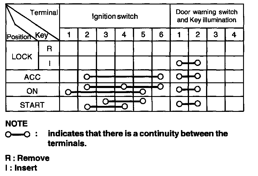 Remove the ignition lock switch and check continuity between the terminals. If the continuity is not as specified, replace the switch.