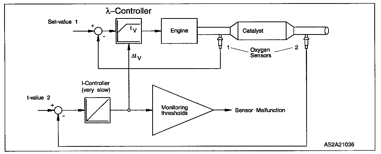 The sensor aging is monitored by comparing the front and rear HO(2)S and also using the correction value (Tv) which determines the mean value of the lean/rich shift necessary for optimal air/fuel ratio-control. With the help of this information, the ECM can make allowance for aging of the front HO(2)S in its injection period calculations. When the parameter-Tv is above or below the specific limits, the ECM will set the diagnostic trouble code HO(2)S Slow Response by aging.