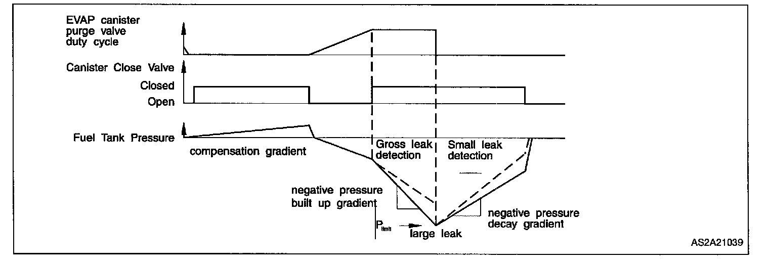The canister close valve and the EVAP canister purge control valve are closed and an increase in fuel tank pressure caused by fuel evaporation occurs (compensation gradient). Afterwards, the canister close valve and the purge control valve are opened. The canister close valve will be shut if the purge control valve reached its final duty cycle.