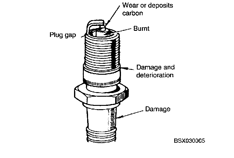 - Broken or burned ceramic insulator. If present replace plug.