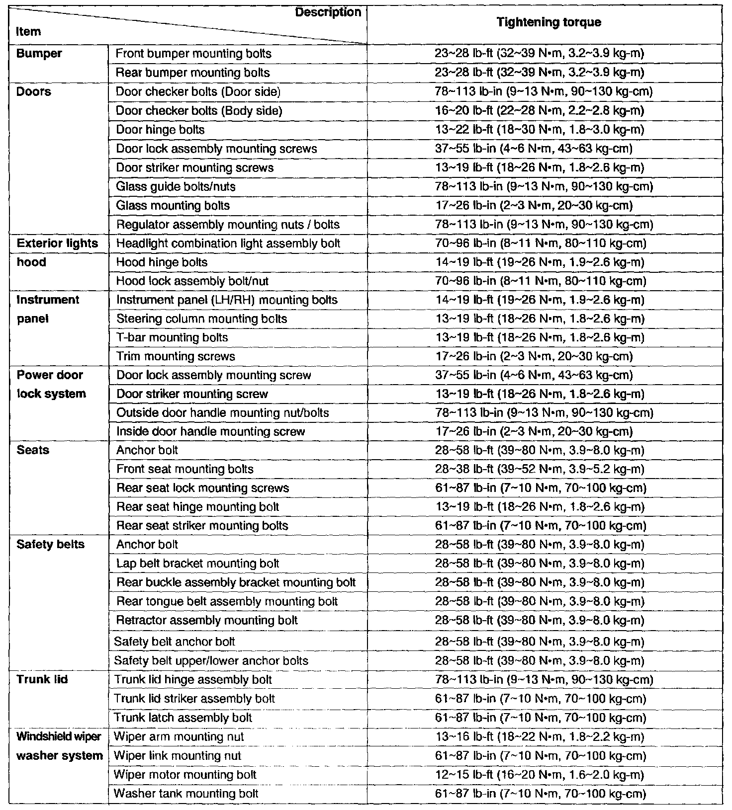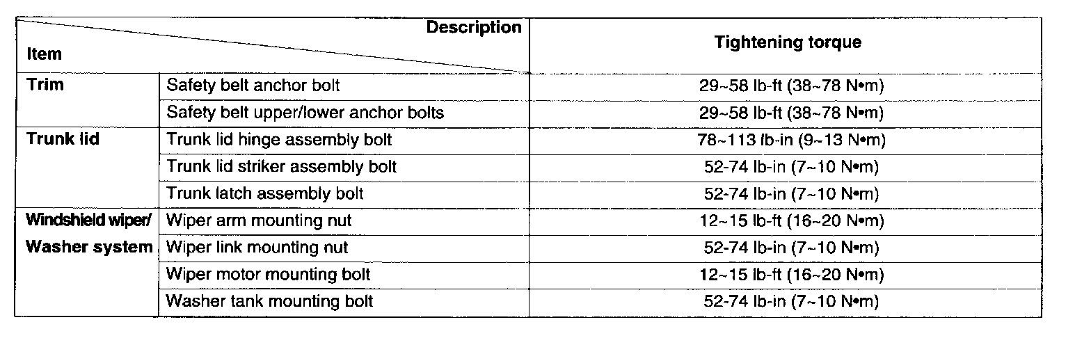 Tightening Specifications (4 Door):