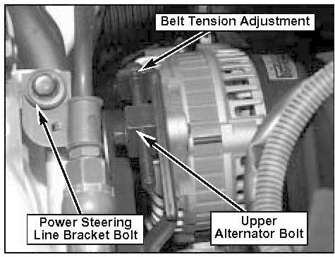 3. Loosen upper alternator bolt and belt tension adjustment.