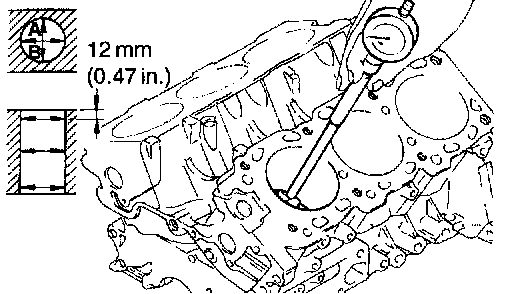 6. To rebore the cylinder to the oversize, keep the specified clearance between the oversize piston and the bore, and make sure that all pistons used are of the same oversize. The standard measurement of the piston outside diameter is taken at a level 12 mm (0.47 inch) above the bottom of the piston skirt and across the thrust faces.