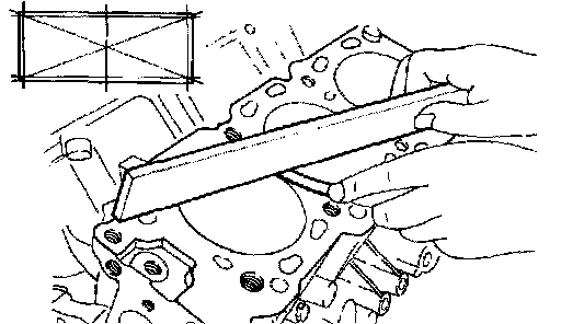 8. Check the top surface of the cylinder block for flatness. If the top surface exceeds limits, grind to the minimum limit or replace.