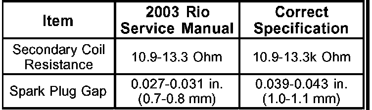The specifications for Secondary Coil Resistance and Spark Plug Gap listed in the 2003 Rio Service Manual are incorrect. The correct values are listed below. Please make the corrections to pages EE4 through EE6 in the 2003 Service Manual. Please note that these corrections apply only to the 2003 Rio (1.6L engine). The specifications currently listed in the 2001 and 2002 Rio Service Manuals (1.5L engine) are correct.