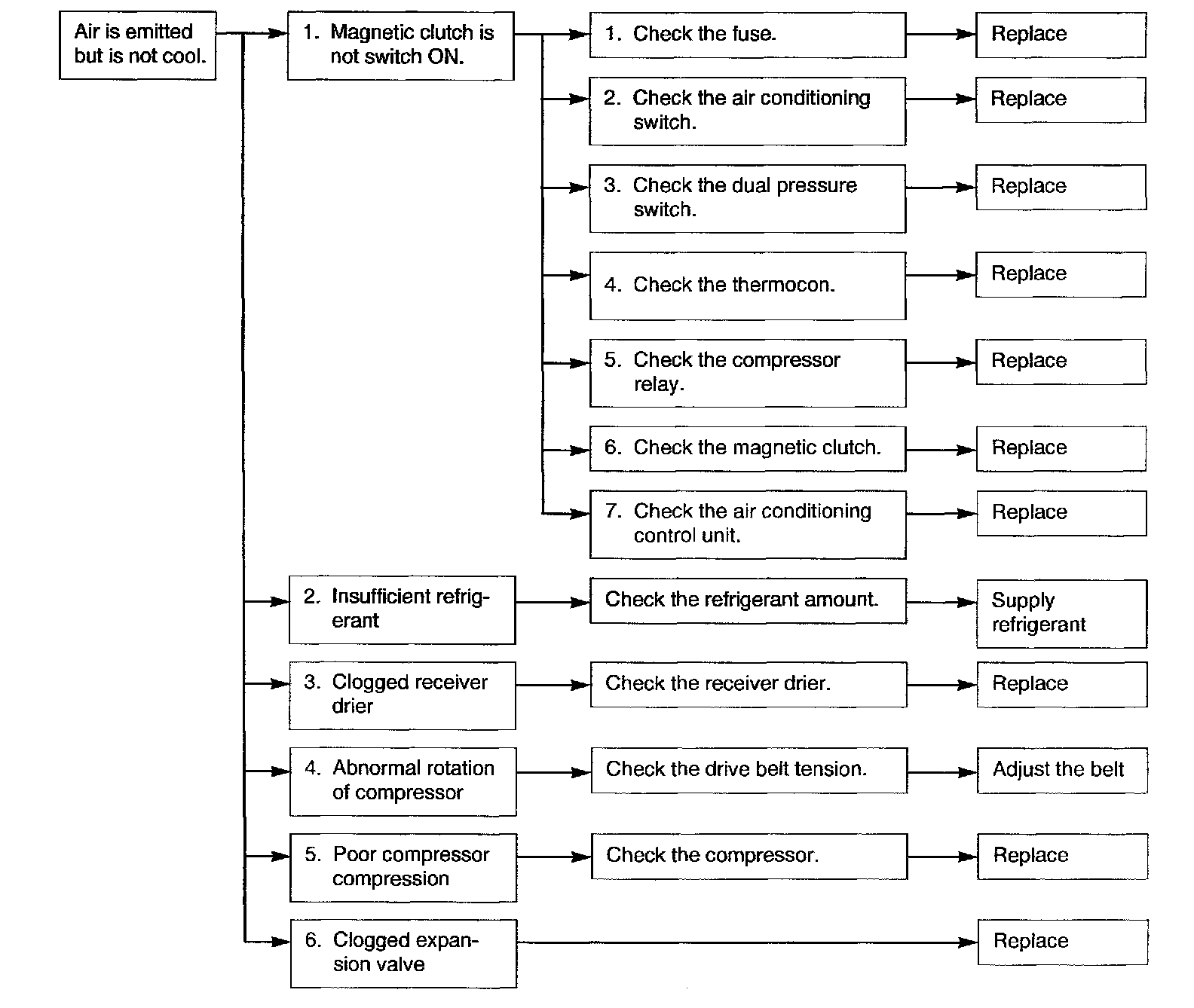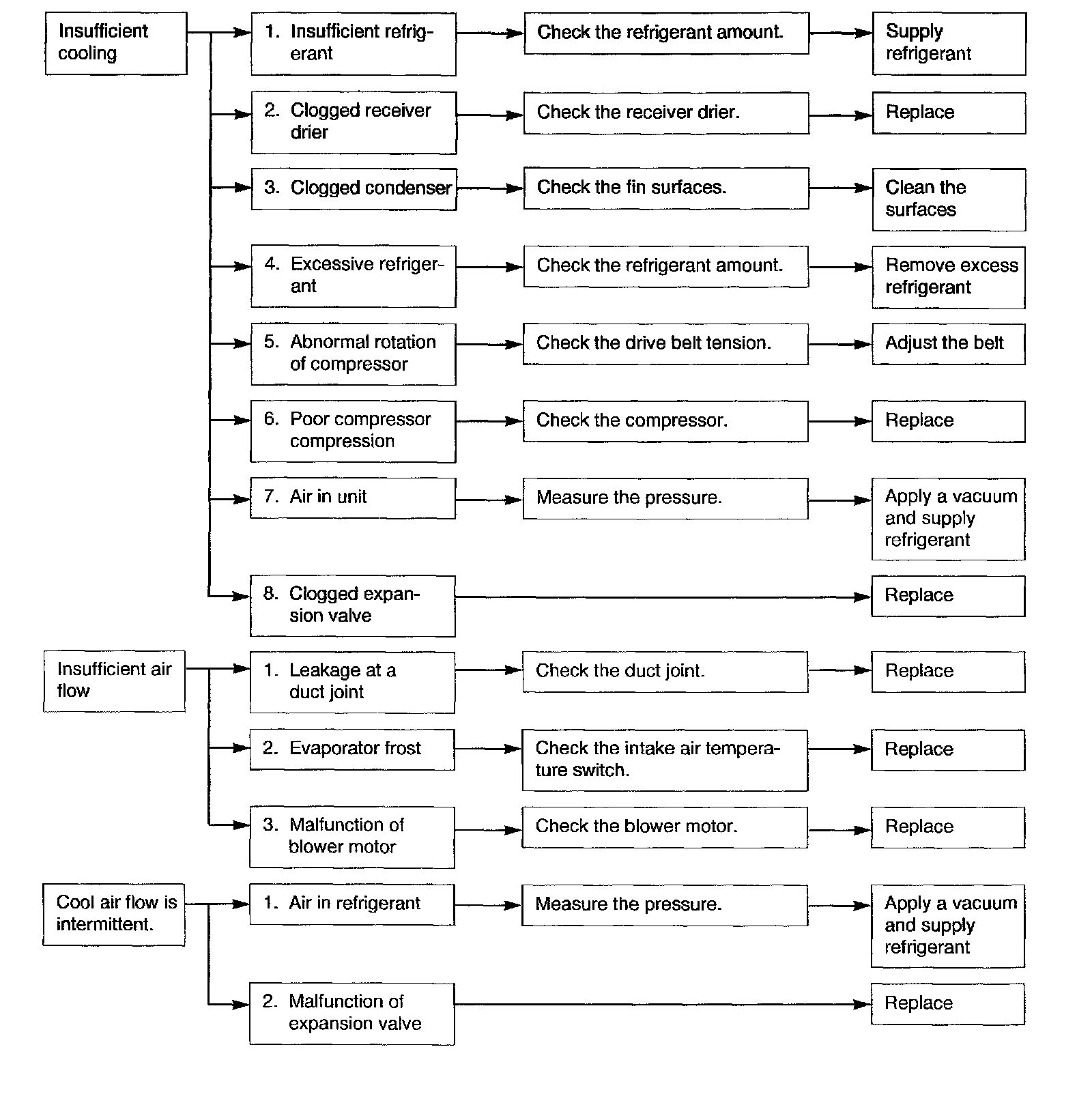 Before replacing or repairing air conditioning components, first determine if the malfunction is due to the refrigerant charge, air flow or compressor. The following diagnostic charts have been developed as a quick reference for determining the cause of the malfunction. If these charts do not satisfactorily describe the problem, refer to the appropriate section for a more detailed explanation. After correcting the malfunction, check the complete system to assure that performance is satisfactory.