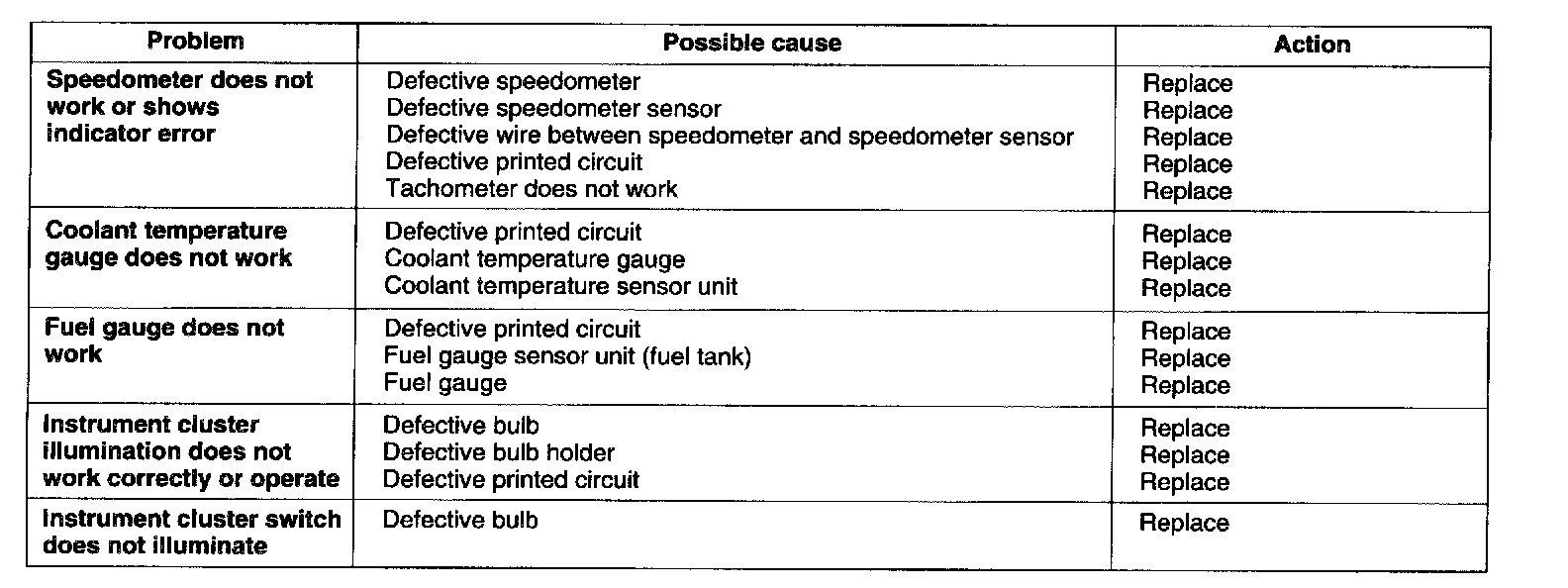 In vehicle use, if an instrument does not run smoothly or indicate correctly, remove instrument and test it in shop to determine fault cause. Remove a tailed bulb by removing instrument cluster. Other problems and their possible causes are listed.