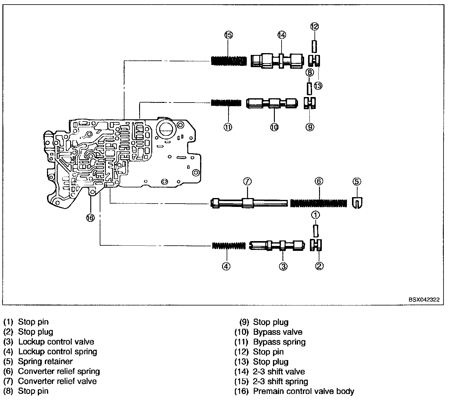 4. Insert lock-up control spring, lock-up control valve and stop plug. Secure them with stop pin.